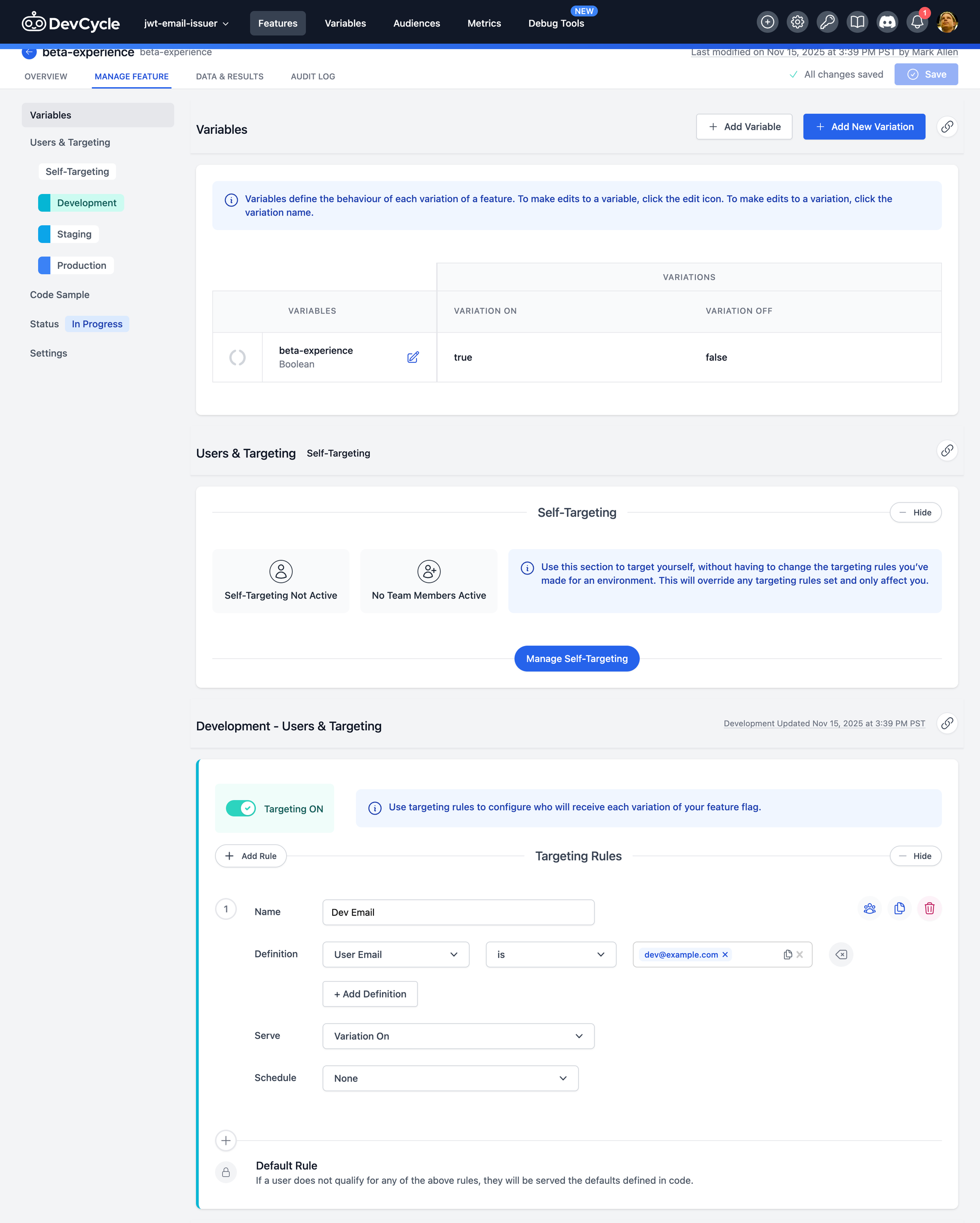 Targeting rule called "Dev Email":