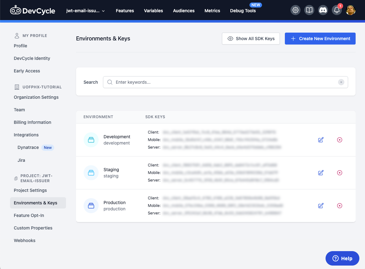 npx json -I -f tsconfig.json -e "this.exclude = ['node_modules', 'dist', 'web']"We'll need to get our DevCycle Server API key from their UI and add it to our .env file.