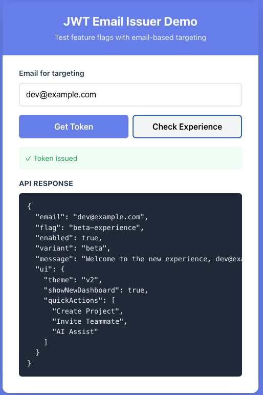 Over the weekend, I built jwt-email-issuer, an Express middleware and React hook that issues short‑lived JWTs based on an email. Pair it with OpenFeature and DevCycle, and you can demonstrate frontend and backend flagging with a handful of lines.