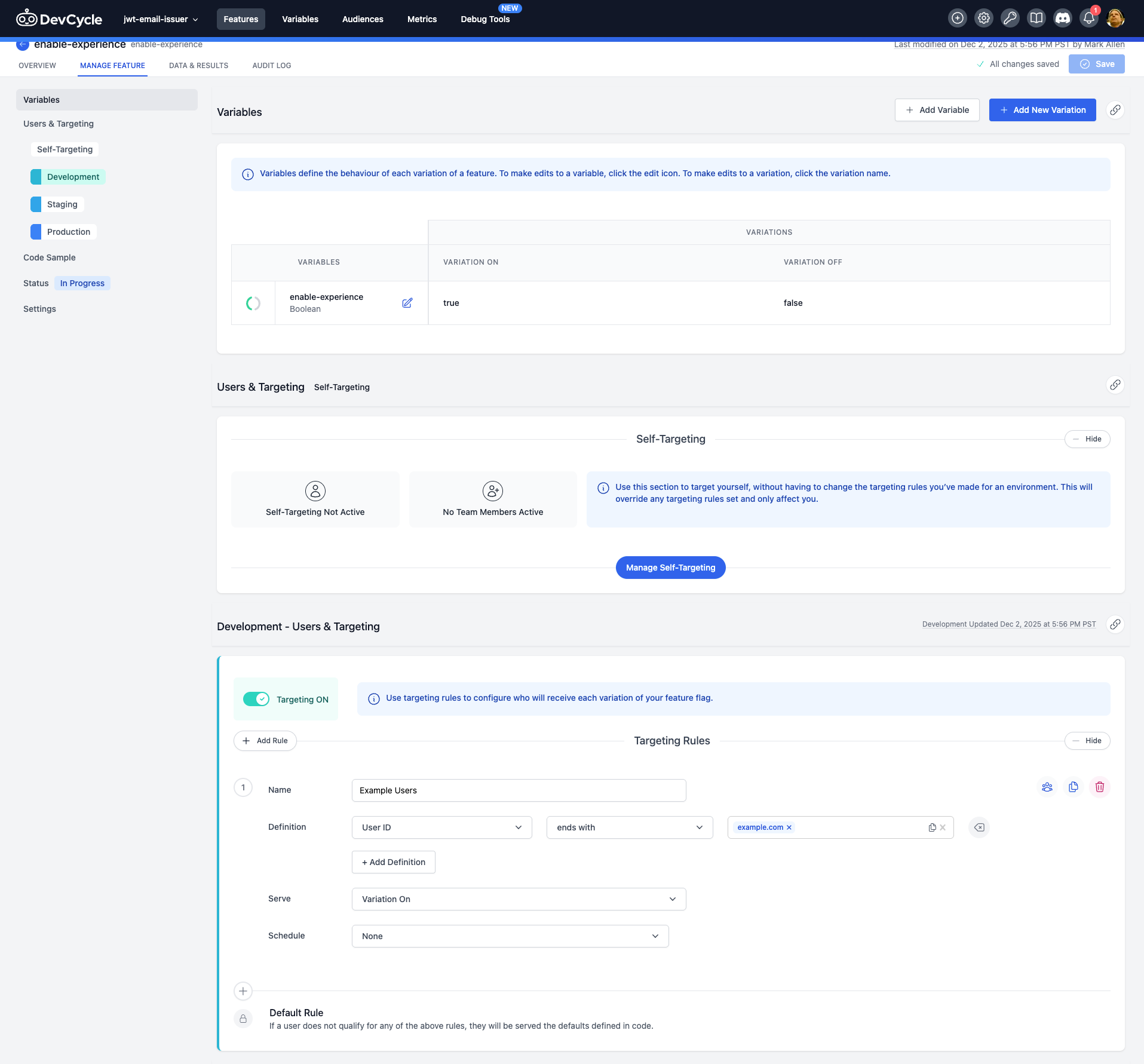 Targeting rule called "Example Users":