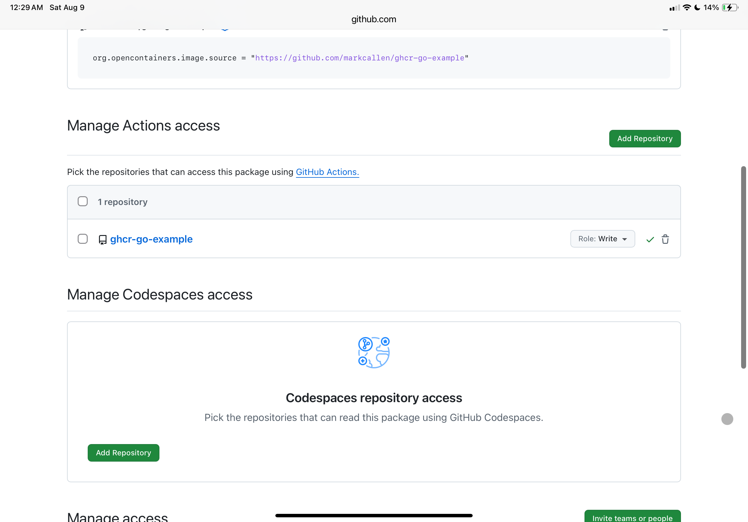 First setup access to the github actions in the Github UI from: https://github.com/USERNAME/ghcr-go-example/pkgs/container/ghcr-go-example